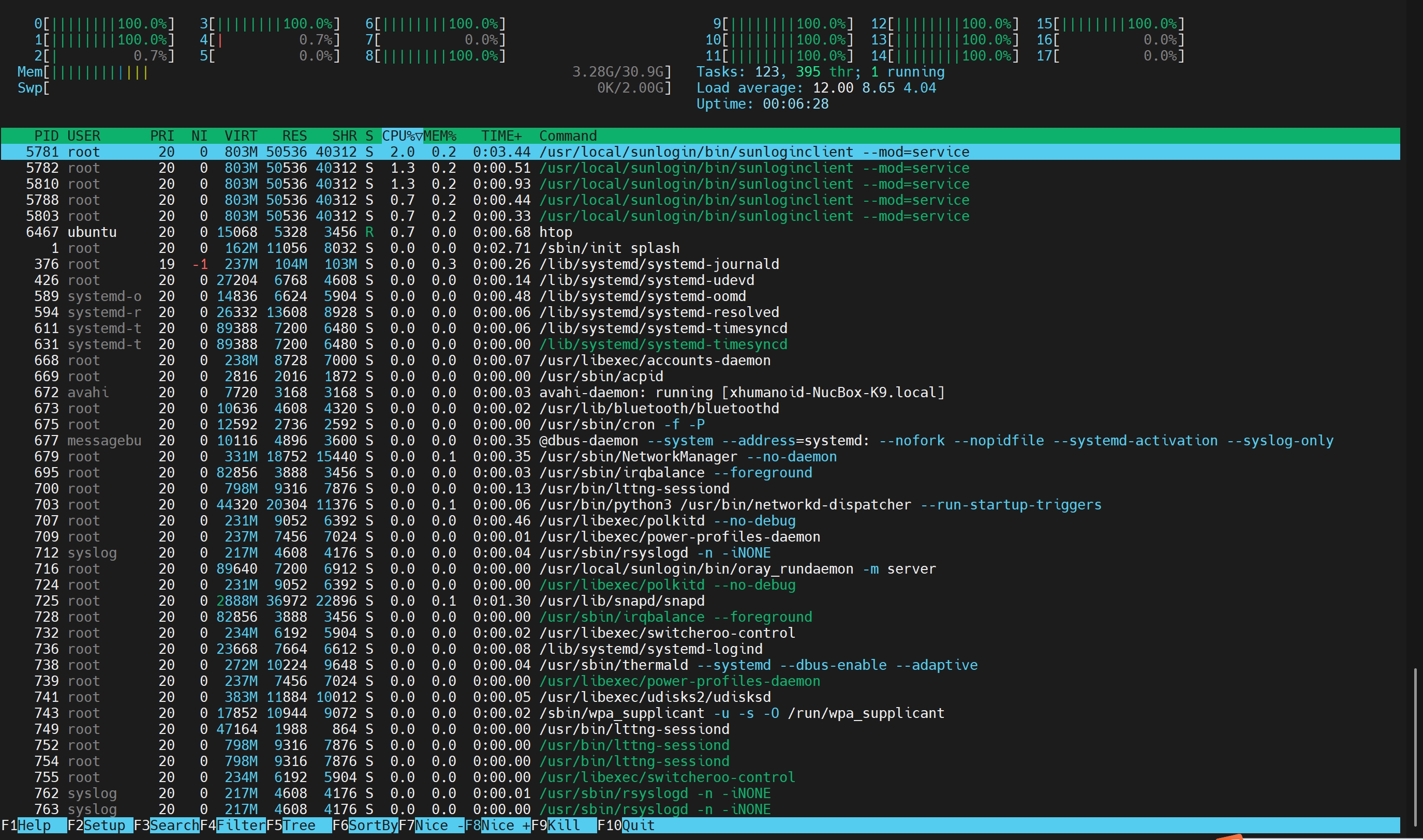 系统CPU使用非常高,达到1200%,但是使用top/htop等工具无法看到具体什么进程使系统CPU占用很高,如下图所示: